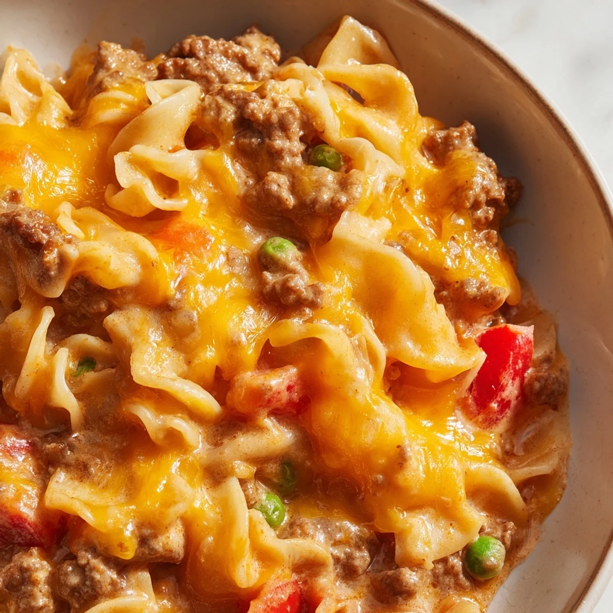 This hearty casserole combines tender egg noodles with savory seasoned ground beef, onions, and peppers in a creamy tomato-mushroom sauce. Topped with melted cheddar cheese, it bakes until golden and bubbly for the ultimate comfort food. Ready in about 55 minutes, this dish serves six and reheats beautifully for leftovers.