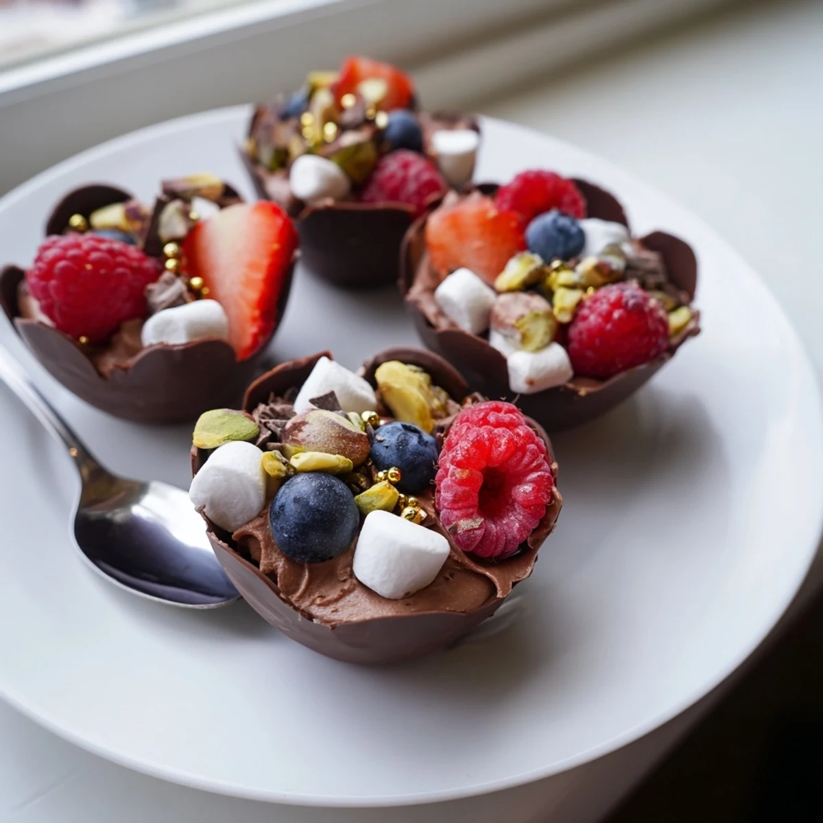 Create stunning edible dessert cups with melted dark chocolate shells filled with silky chocolate mousse. These individual servings feature fresh mixed berries, chopped nuts, mini marshmallows, and chocolate curls, with optional edible gold for extra elegance. Perfect for dinner parties, holiday gatherings, or special celebrations where presentation matters. The components come together quickly—just 25 minutes prep plus chilling time—yet deliver restaurant-quality results. Customize with white or milk chocolate variations, add orange liqueur for an adult twist, and serve chilled for the best texture. Each cup offers layers of velvety smoothness, tart fruit sweetness, and satisfying crunch in every luxurious bite.