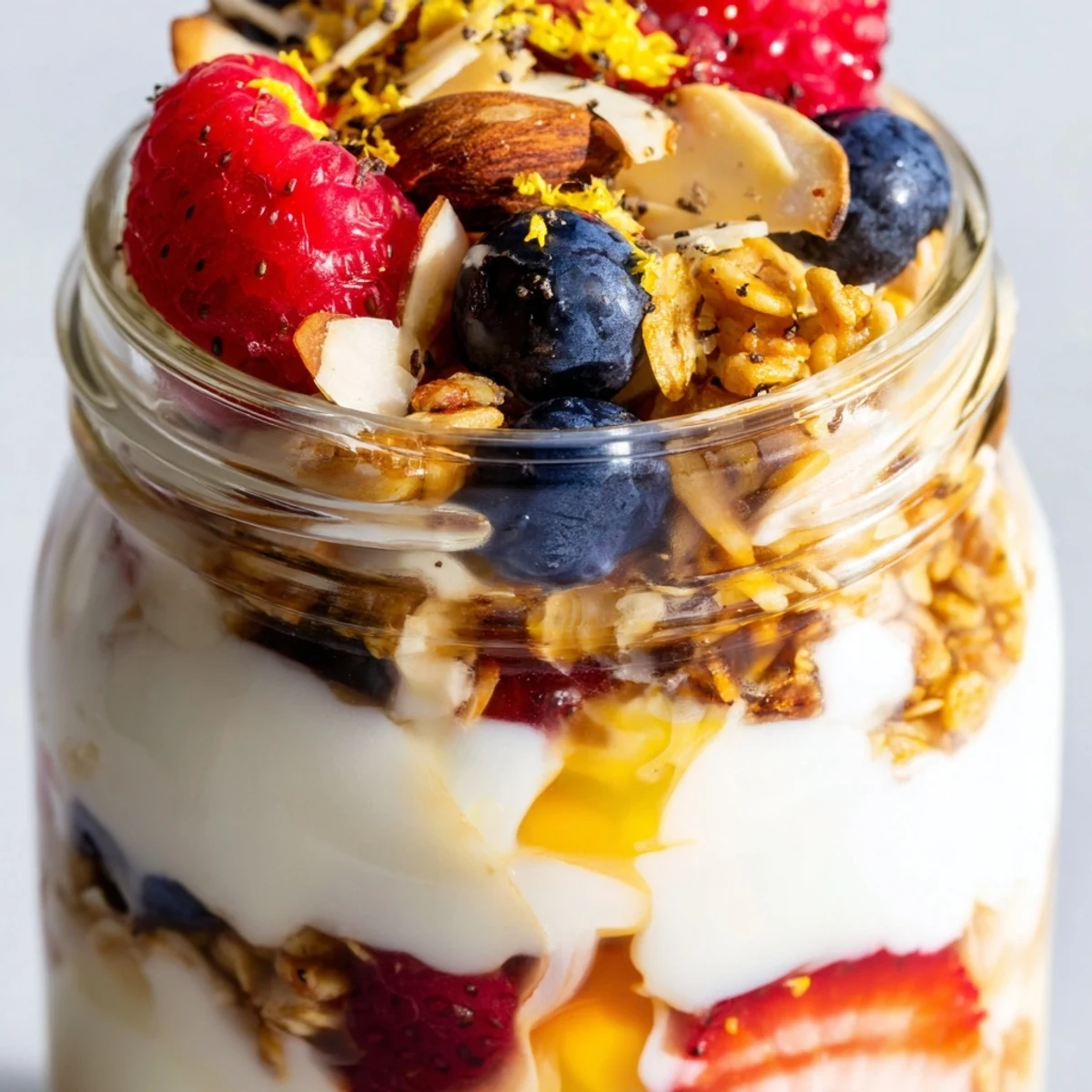 - Keep layering yogurt, honey, berries, and granola until you reach the top of each glass. Crown everything with remaining granola, nuts, chia seeds, and lemon zest for that picture-perfect finish.