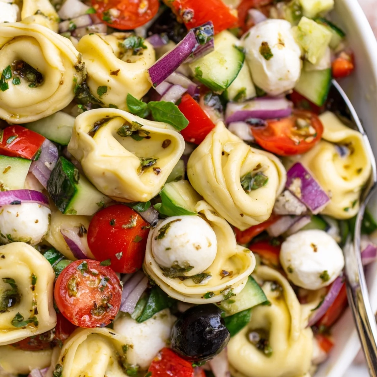 This vibrant tortellini salad combines tender cheese-filled pasta with colorful cherry tomatoes, crisp cucumber, red bell peppers, black olives, and mozzarella balls. The zesty homemade dressing featuring extra virgin olive oil, red wine vinegar, and aromatic herbs ties everything together beautifully.